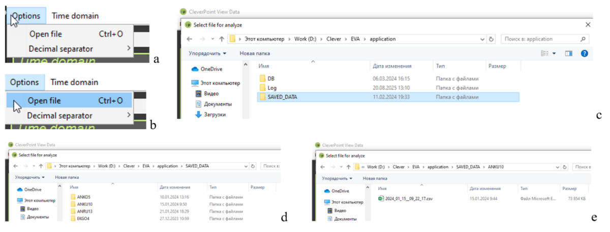 Теперь давайте загрузим файл с данными человека, который Вас интересует. Кликаем на окошко «Options» в верхнем левом углу экрана (рис 1.2.a), затем на «Open file» (рис.1.2.b) и попадаем в окно навигации, в папке «SAVED DATA» которого хранятся данные Ваших записей (рис. 1.2.c). В папку «SAVED DATA» файлы записываются автоматически и хранятся уже в папке, обозначенной кодом респондента и номером по очередности записи (рис. 1.2.d). В папке же самого респондента файл с расширением *.csv (где вместо * дата и время записи) и есть тот самый файл, предназначенный для загрузки в Rozoom Explorer (рис. 1.2.с).