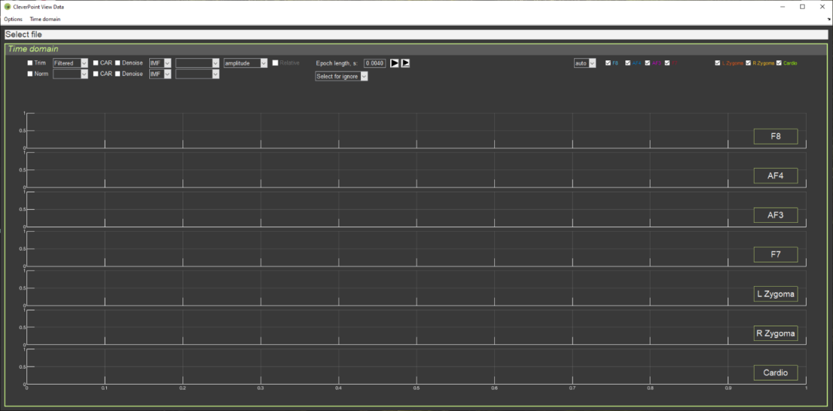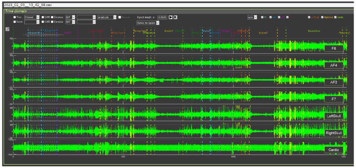 При загрузке нужного файла на стартовой странице отразятся кривые ЭЭГ (отведения F8, AF4, AF3 и F7, расположенные в лобных отделах на лицевой накладке), ЭМГ (L и R Zygoma, расположенные в области скуловой кости) и ЭКГ (Cardio). На экране будут выведены кривые за весь период тестирования в Rozoom Lab, а это не менее 20 минут. Поэтому на для каждого отведения Вы увидите частоколы биоэлектрических кривых, с которыми предстоит работать (рис. 1.4).