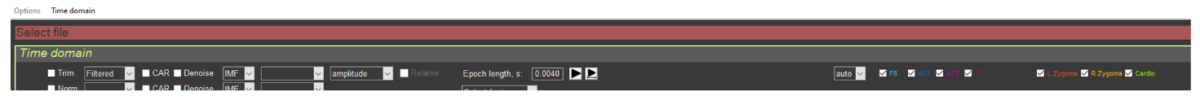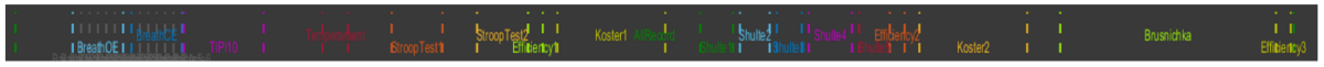 Страница «Time domain» предназначена для работы с первичными данными тех сигналов, которые на ней отражаются. Сразу обращаем Ваше внимание на верхний участок экрана, что над ЭЭГ кривой в отведении F8 (рис. 1.5). На этом месте указаны все этапы тестирования в Rozoom Lab. Следует отметить на цветовое обозначение каждого этапа, которое будет повторяться на каждой странице Rozoom Explorer. Каждые этап ограничен и вертикальными пунктирными линиями соответствующего цвета, что позволяет при необходимости выделять заинтересовавший нас участок на графиках.