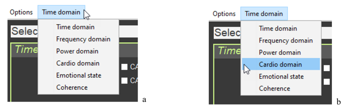Для общей картины психоэмоционального состояния человека, прошедшего тестирование, и иллюстративной помощи при проведении консультации наиболее подходит страница «Cardio domain». К ней мы и обратимся для рассмотрения наиболее общих моментов, а к «Time domain» мы еще вернемся в соответствующей главе руководства. Нажимаем на окошко «Time domain» в верхнем левом углу экрана (рис 1.6.a), выбираем закладку «Cardio domain» (рис 1.6.b) и кликаем один раз.