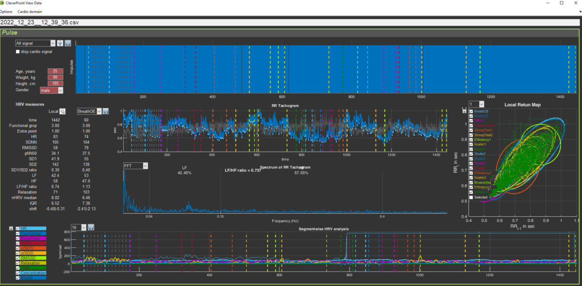 Вернемся к рисунку 6 и обратим внимание на вертикальные полоски на каждом из графиков и подписям и овалам на «облаке» точек на графике справа на странице «Cardio Domain». Все также, как и на странице «Time domain» (в подтверждение уже вышесказанного: такая же система маркировки этапов тестирования в Rozoom Lab будет сохраняться и на других страницах).