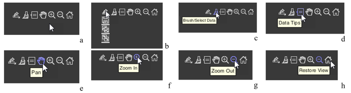 Значок, которые позволяет поставить метку на графике — «Data Tips» (рис. 1.8.d). Активация этого значка открывает для Вас возможность узнать точные координаты точки на кривой с выведением окошка с данными этой точки по осям абсцисс и ординат. Координаты для каждого графика свои. Их описание будет предоставлены в главах, где эти графики будут описаны. Там же будут и примеры использования этого значка. Есть возможность выставить данные не одной точки, а нескольких. Эта возможность открывается при удерживании клавиши «alt» на клавиатуре.