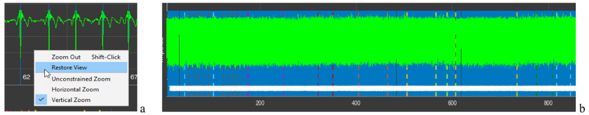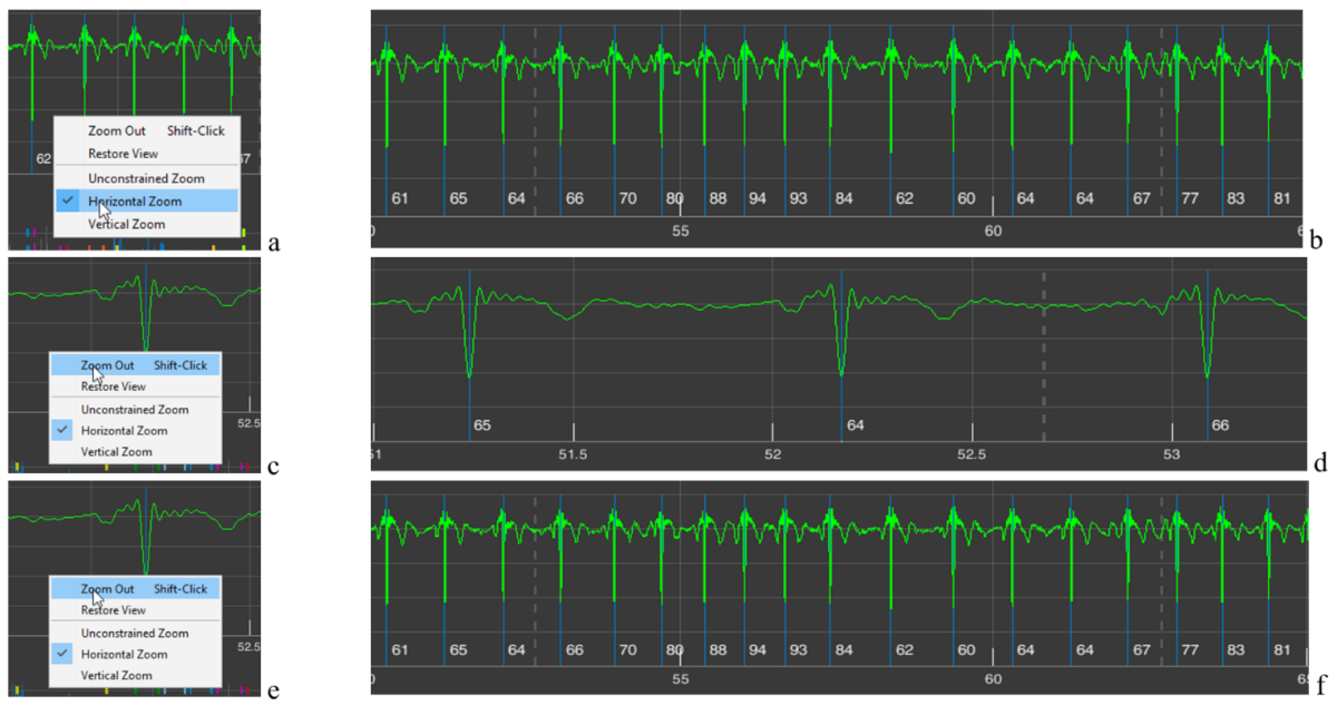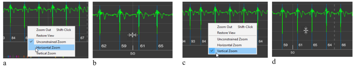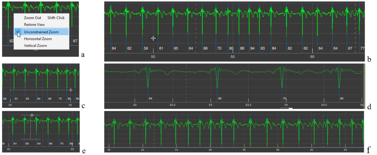 Начнем со знакомого уже значка «+» — «Zoom In» (рис. 1.8f). Если Вы, активировав этот значок (активный значок окрашивается в синий цвет), переведете курсор на изображение в секторе 4 и нажмете правую кнопку мышки, то появится окошко с перечнем дальнейших действий (рис.2.11a). По умолчанию (помеченная строка дополнительно еще и подсвечена, переведенным на нее курсором) активирована функция, когда Вы можете увеличивать изображение как по горизонтали (горизонтальное увеличение мы рассмотрели при описании подподраздела «Сектор 1.4»), так и по вертикале. Выбор направления зависит от Вас. Если Вы, нажав и удерживая левую кнопку мышки выделите горизонтальный участок, то ЭКГ растянется по горизонтали или временной шкале (рис.2.11 c, d), если выделите участок ЭКГ по вертикале, то ЭКГ увеличится на экране по амплитуде в окне сектора в пределах выделенного Вами диапазона (рис.2.11e, f).