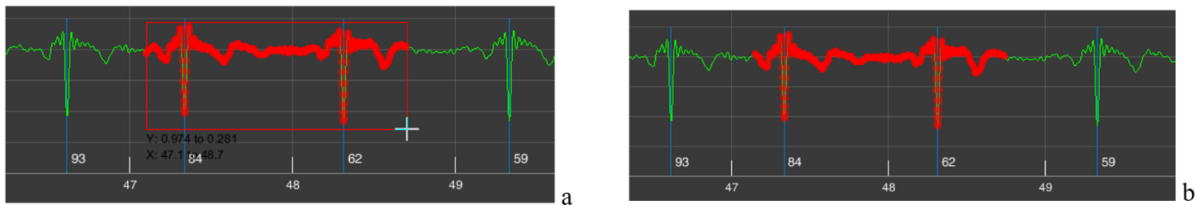 Значок, изображающий строчки в окошке – «Data Tips» (рис.1.8d). Напоминаем, что с его помощью можно определить координаты точки на кривой, которая нам интересна. Для этого активируем значок, переводим курсор на нужное нам место на кривой, кликаем левой кнопкой мышки и получаем окошко координат (рис.2.17a). При необходимости место положение можно подкорректировать стрелками «<» и «>» на клавиатуре. По оси «Х» указано время, по оси «Y» — амплитуда сигнала (для ЭКГ на нашей шкале в V (вольтах)). Удерживая клавишу «Alt», можно на кривой установить данные большего количества точек (рис. 1.17b).