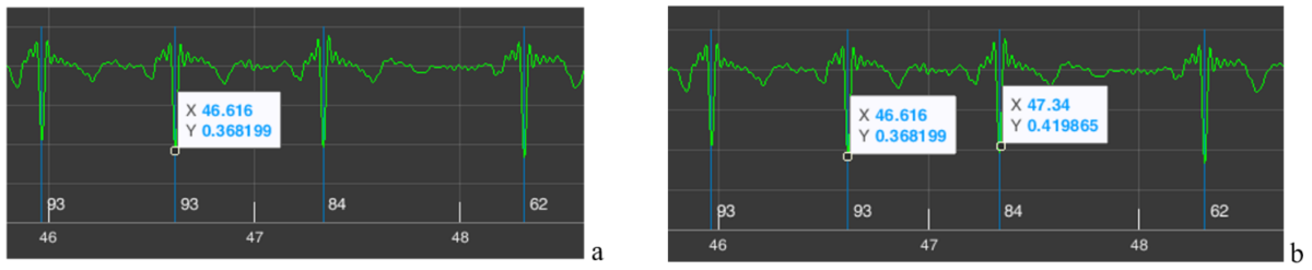 В нашем примере мы обозначили на ЭКГ два следующих друг за другом зубца R. Напомним, что рядом с синей линией маркирующих зубец R внизу указано значение мгновенной ЧСС – 84 у второго «нашего» зубца R. Давайте проверим. Время появления нашего первого зубца R 46,616 секунд, второго – 47,340 секунды. Рассчитываем длительность RR интервала — 47,340 с — 46,616 с= 0,718 с. Теперь рассчитаем какой бы была ЧСС при таком интервале между последовательными сокращениями сердца: ЧСС= 60/0,718 = 83,6 уд/мин или ≈ 84 уд/мин. Делаем вывод, что автоматический расчет верен.