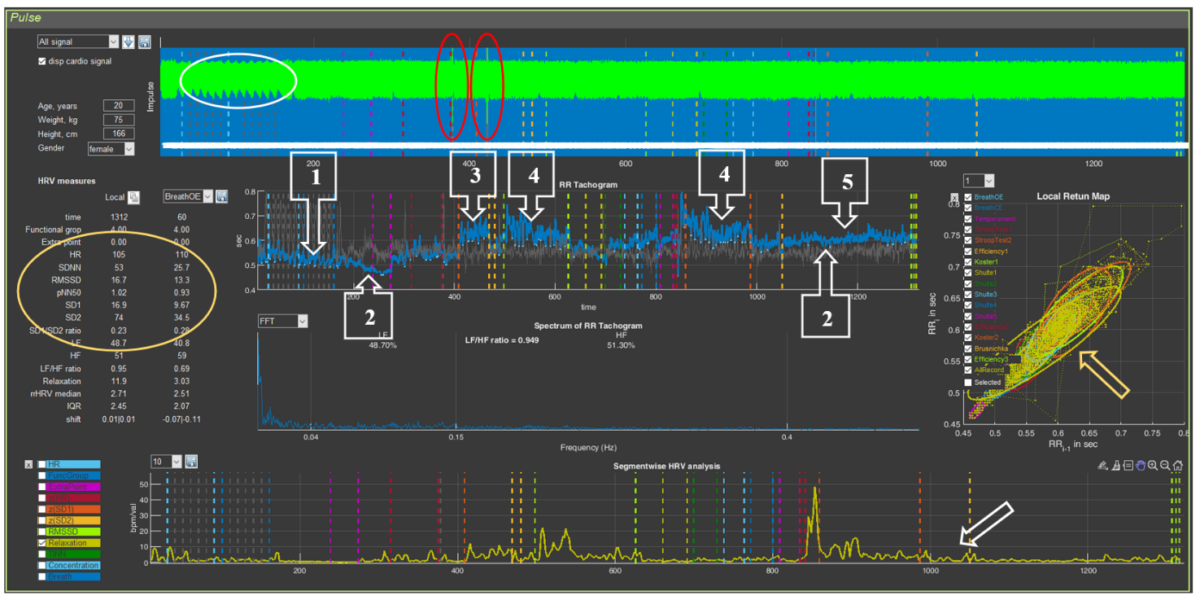 При целостном восприятии страницы «Cardio domain» можно выделить следующие моменты: 1. состояние выраженного волнения, что проявилось уже в начале теста и сохранялось на протяжении всей VR сессии в форме тахикардии (см. значения ЧСС (HR) на рис.3.31 в секторе 3); 2. крайне низкая вариативность сердечного ритма, что проявляется в виде узкой формы КИГ, вытянутых овалов диаграмм рассеивания (желтая стрелка) и подчеркивается цифрами показателей ВСР (на рисунке выделено желтым овалом); 3. нехарактерная реакция в виде урежения сердечного ритма во время выполнения теста, связанного с когнитивным напряжением; 4. на этапах отдыха ЧСС урежается, но не достигает значений, характерных для нормы (средняя величина длительности сердечного цикла около 0,65 сек, что соответствует 92 уд/мин); 5. на последнем тесте функциональное состояние респондента стабилизировалось, но на уровне около 100 уд/мин. Все это логично укладывается в крайне низкие значения такого показателя, как состояние покоя (на рис. 3.31 в секторе 8 указано белой стрелкой).