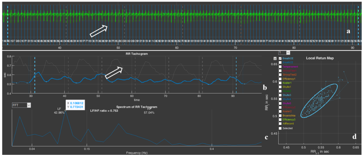 Медленное дыхание, предлагаемое в Rozoom Lab, должно «раскачать» ВСР. Однако в нашем примере размах значений RR интервалов крайне скромен (рис.3.32b). При этом такие показатели как расположение пика спектрограммы по горизонтальной оси в зоне соответствующему 6 /мин (рис.3.32c) и динамика амплитуды зубца R (рис.3.32a), которую более наглядно иллюстрирует огибающая R зубцов (рис.3.32b серая линия), указывают, что респондент дышал в ритме, заданных в тесте. Следовательно низкие значения ВСР можно связать с избыточной активностью симпатической нервной системой, а состояние респондента оценить как стресс.