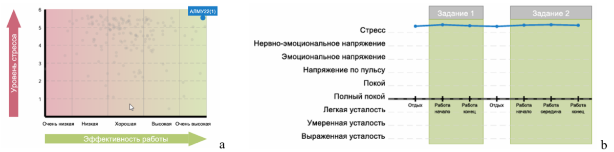 Рисунок 3.33. Диаграммы главы 3 отчета (пример 4): a – функциональный тип обеспечения работоспособности; b — функциональные состояния респондента в процессе выполнения тестовых заданий.